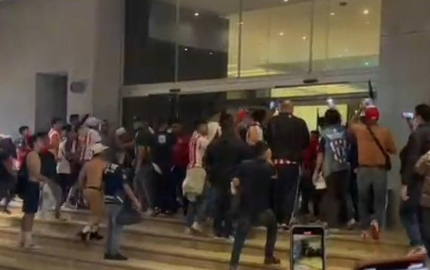 Todo se salió de control cuando salieron los futbolistas, los reclamos se elevaron y la seguridad del hotel no pudo contener a los aficionados que terminaron rompiendo una de las puertas.