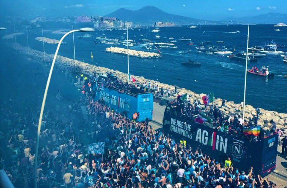 Escuelas y guarderías cerradas en la zona en la que los autobuses con jugadores, cuerpo técnico y presidente del club, hicieron acto de presencia. Y al menos 200 mil napolitanos tiñeron de azul, más aún, la ciudad de Nápoles, totalmente volcada con su equipo, merecido campeón de la Serie A más igualada de la historia con una victoria en la última jornada ante el Cagliari (2-0).