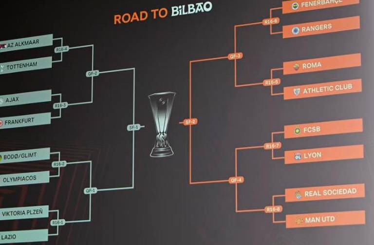 La Real Sociedad y el Manchester United han quedado emparejados una vez más en una competición de clubes de la UEFA, mientras que el AZ Alkmaar se enfrentará al Tottenham por segunda vez esta temporada, tras haberse visto las caras en la fase liga. El Fenerbahçe de José Mourinho se enfrenta al Rangers, mientras que el anfitrión de la final, el Athletic Club, visitará el estadio de la Roma en la ida.