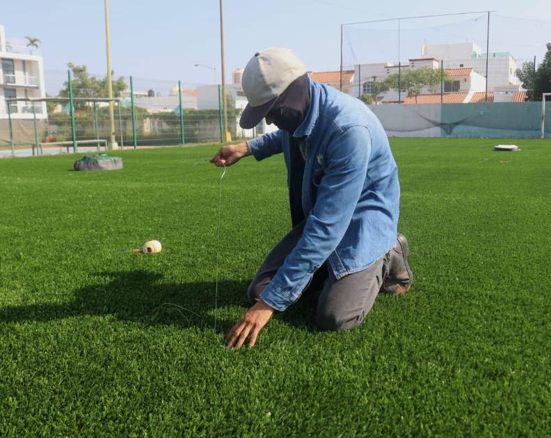 Entre los trabajos realizados se encuentran el retiro del pasto deteriorado y la limpieza de la plancha de concreto para colocar el nuevo césped artificial.