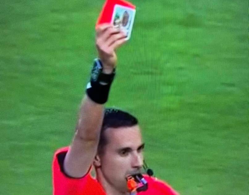 El juez central mostró la tarjeta roja y al mismo tiempo mostró, por error, una imagen de la Virgen de Guadalupe que tenía en el mismo bolsillo del short donde guardó las tarjetas del juego.