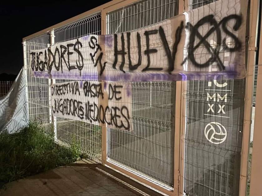 Con leyendas como “Jugadores sin h...” y “Directiva basta de jugadores mediocres”, las mantas fueron colocadas por aficionados en una de las rejas de entrada de la casa de los Cañoneros.