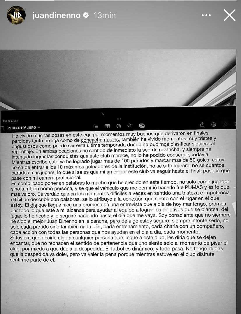 Mediante una carta que publicó en sus redes sociales, Dinenno se despidió de Pumas.