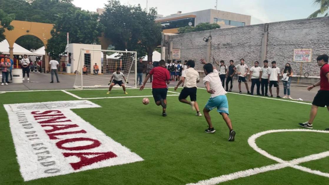 El Pids colocó una cancha movible de pasto sintético, a un costado del Teatro MIA, en esta cancha se está llevando a cabo un torneo de futbol 5 entre distintas preparatorias de Culiacán.