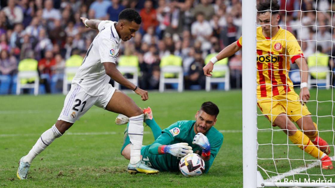 El ritmo era frenético y el Girona pudo hacer el 0-1 con un cabezazo desviado de Valery. El líder respondió en el 22’ con una rosca ajustada de Camavinga que se fue cerca del palo derecho de Gazzaniga.