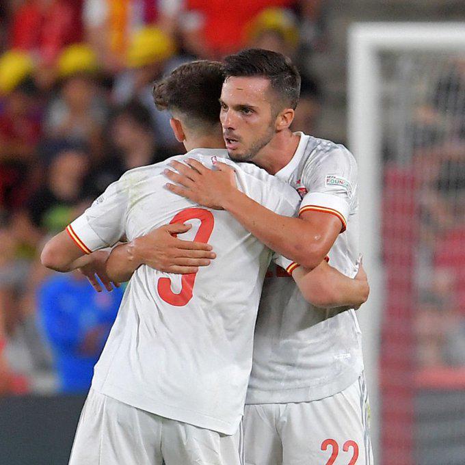 Exigida por conseguir los tres puntos, España salió desde el inicio en busca del gol y en el minuto 13 ya ganaba gracias a un gol de Pablo Sarabia a pase de Marcos Llorente.