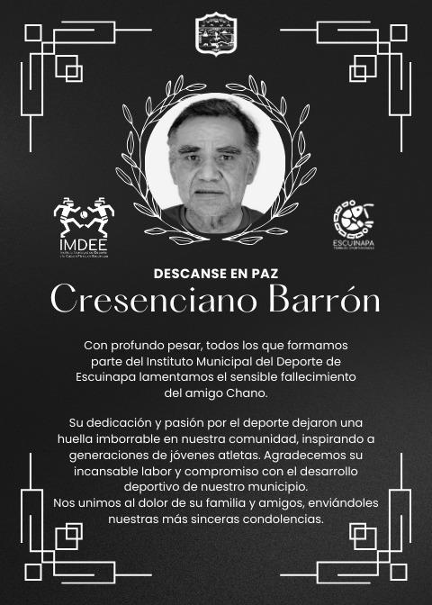 Trinidad Ibarra, titular del deporte escuinapense, informó que se está a la espera de lo que la familia disponga para rendirle un homenaje a José Cresenciano Barrón Contreras.