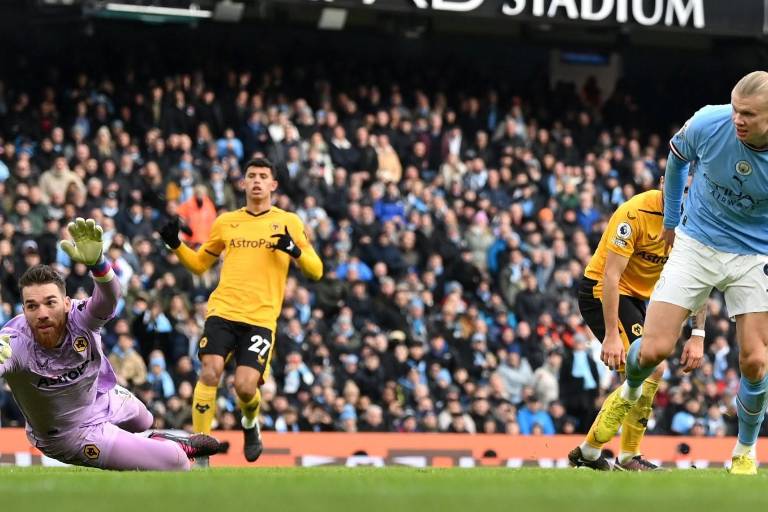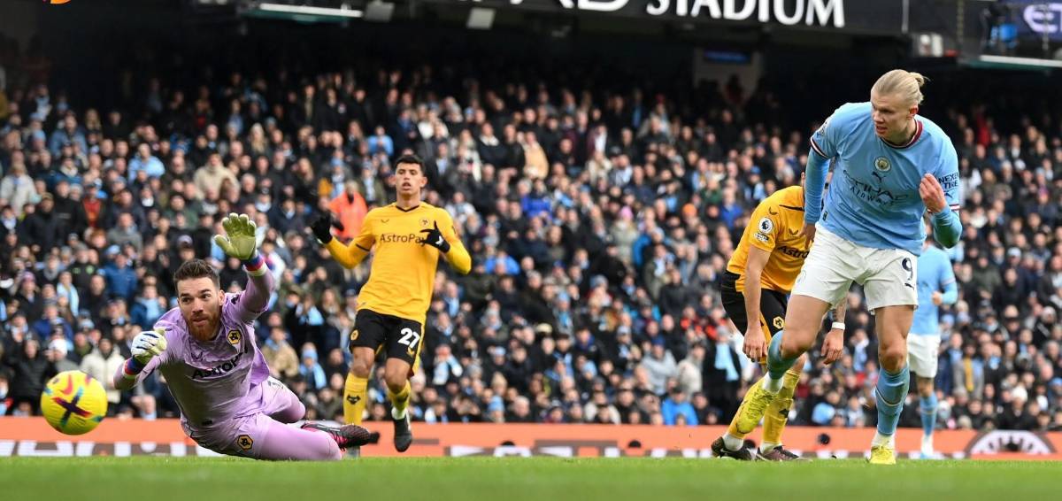 MANCHESTER CITY._ Erling Haaland fue el héroe del Manchester City con triplete, ya su cuarto de la temporada en la Premier League, y aseguró una victoria por 3-0 sobre los Wolves del mexicano Raúl Jiménez.
