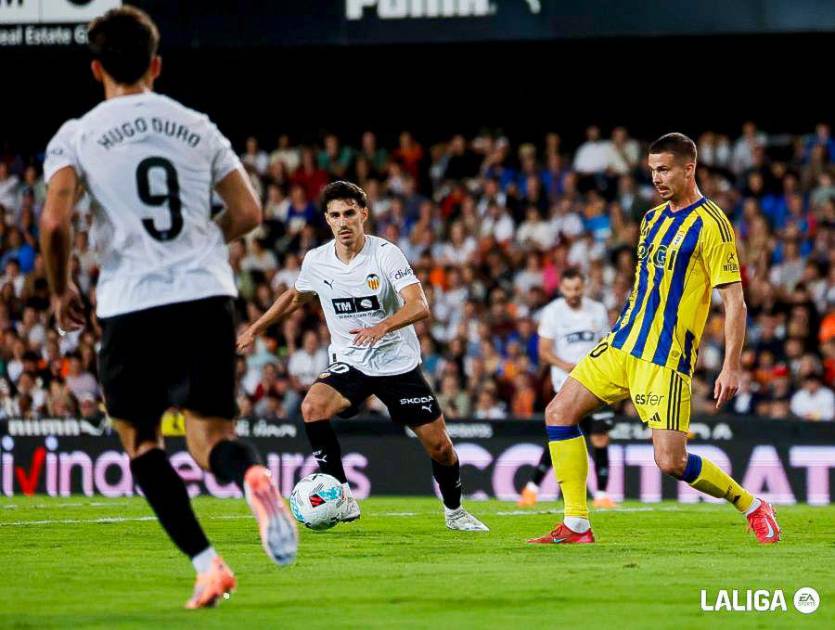 Un día después de lo previsto, el Valencia saltó al césped de Mestalla con dos cambios. Javi Guerra volvió a la titularidad y André Almeida lo fue por primera vez, justo después de su renovación hasta 2029, para suplir a Diego López. En el Oviedo, Fede Viñas regresó directo al once y la gran novedad fue la entrada del argentino Santiago Colombatto.