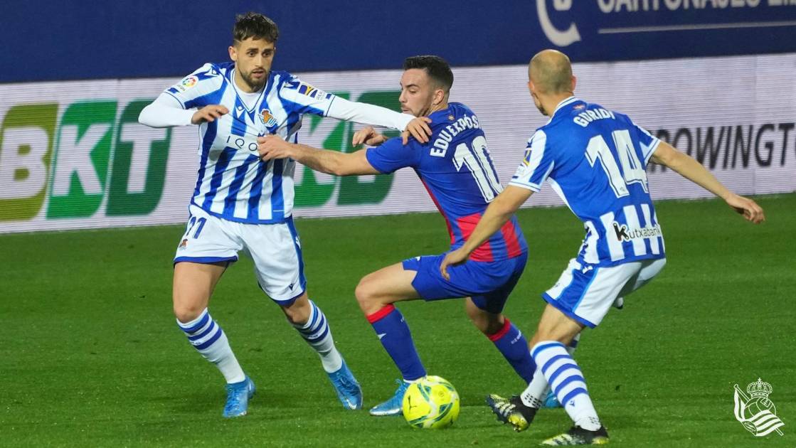 Dos cabezazos de Kike García en el segundo período y especialmente un lanzamiento de falta de Arbilla que obligó a una intervención espectacular de Remiro fueron el bagaje ofensivo del Eibar, que lo intentó durante los 90 minutos y aunque se dejó la piel no pudo marcar gol alguno y ve como se alejan sus últimas esperanzas de salvación, mientras que la Real se consolida en la quinta plaza y coge ventaja para Europa con relación al Villarreal y el Betis, su dos máximos rivales.