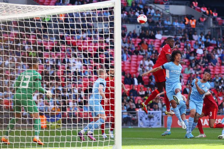 Antes del minuto diez Konaté dejó en evidencia a la defensa del City rematando por encima de Nathan Aké un córner de Robertson. Primer golpe a la nuez del City, que se había pasado una semana regodeándose por un recorte de Ederson en la línea de gol en el partido de la Premier. Volvió el karma. Esta vez no fue el brasileño, sino Zack Steffen. Mala cesión de Aké, el estadounidense se durmió, Mané le presionó, le robó la cartera e hizo el 0-2.