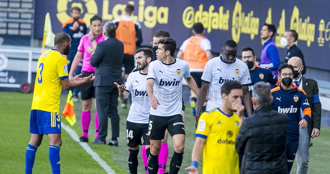 CÁDIZ._ Los jugadores del Valencia se retiraron del campo del Ramón de Carranza pasada la media hora de su partido contra el Cádiz después de una discusión entre el valencianista Mouctar Diakhaby y el cadista Juan Cala, una decisión que llegó después del gran enfado mostrado por el francés.
