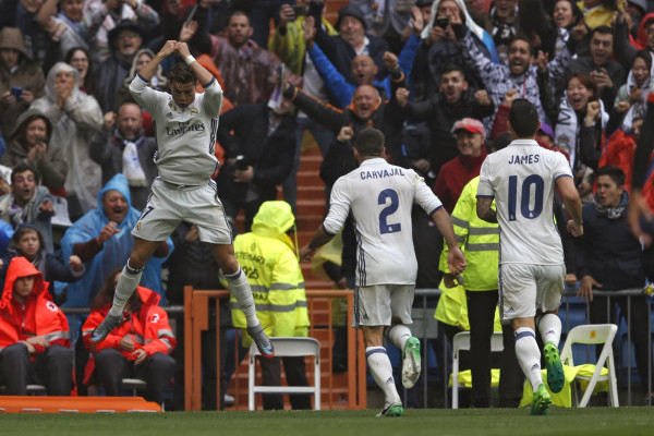 En el estadio Santiago Bernabéu, Santi Mina tuvo en su mano poner en ventaja al Valencia al primer minuto de juego, pero el costarricense Keylor Navas salvó la doble ocasión del atacante gallego, y el Madrid rozó el gol a balón parado con lanzamientos directos de Cristiano y el colombiano James Rodríguez, sorpresivo titular en lugar del lesionado Gareth Bale.
