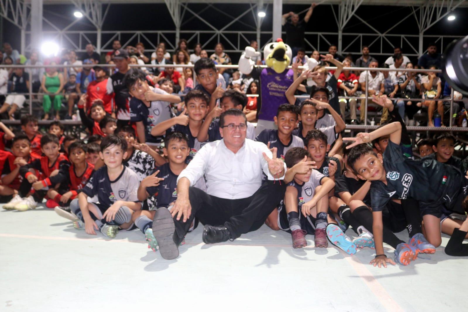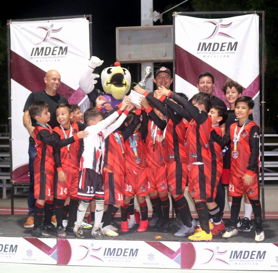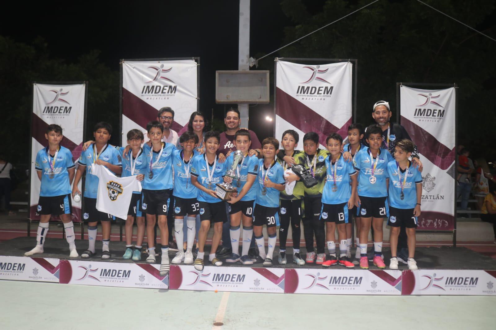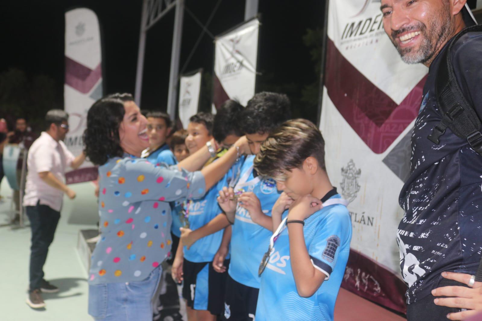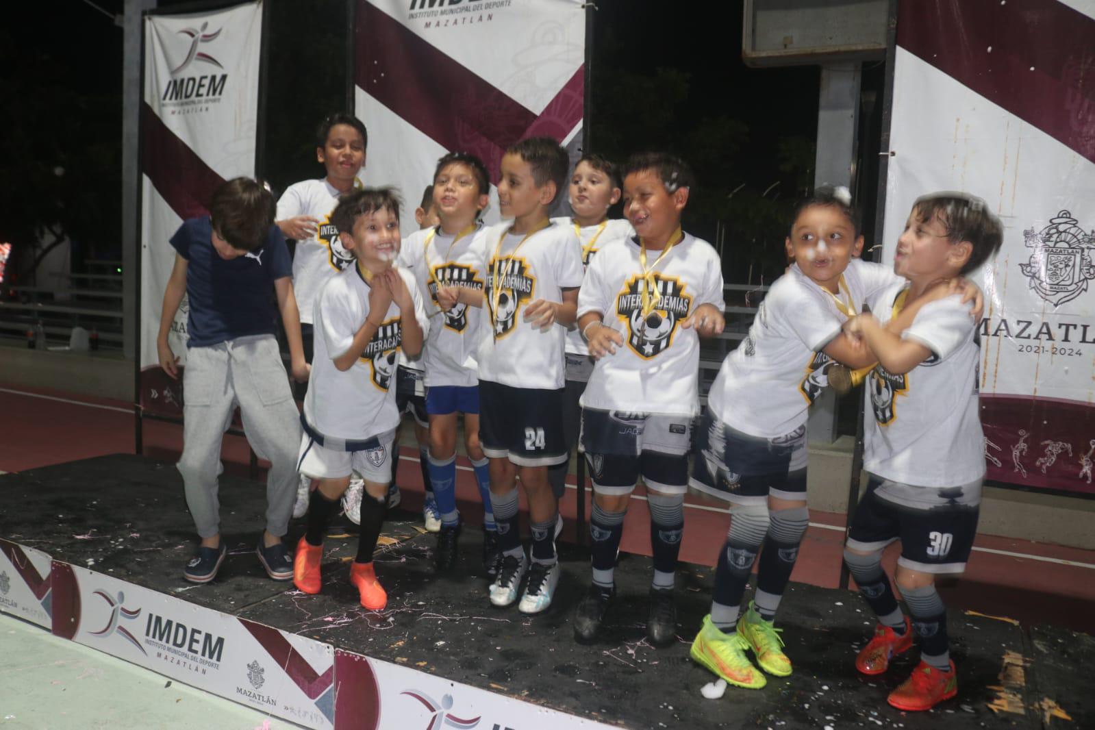 MAZATLÁN._ Con gran entusiasmo y alegría, los niños campeones del Torneo de Futbol Interacademias 2023 recibieron reconocimientos en la ceremonia de premiación y clausura del certamen, realizado en la Unidad Deportiva Benito Juárez.