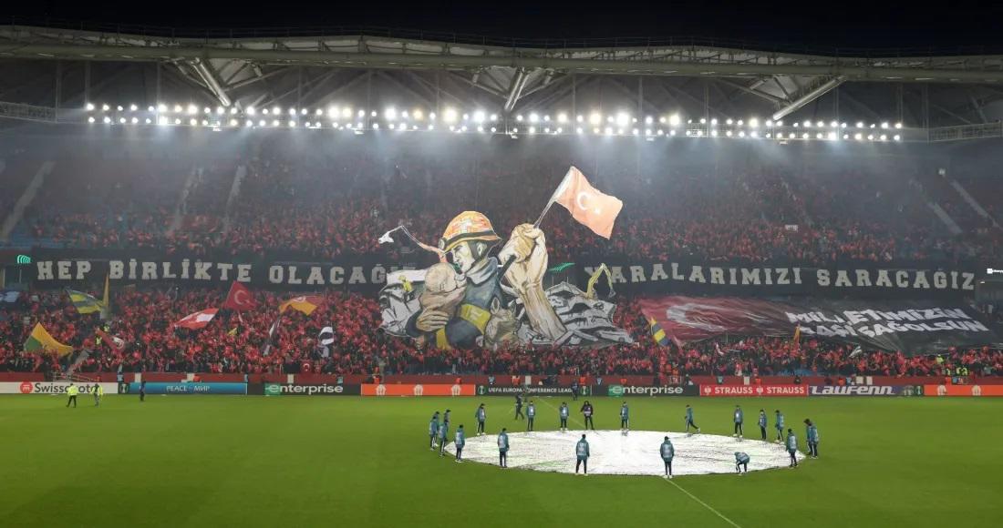 Previo al comienzo del partido entre el Trabzonspor y Basel en la primera ronda de eliminatoria de la Europa League, durante el minuto de silencio en honor a las víctimas de los sismos en Turquía, un tifo fue desplegado en uno de los lados de la tribuna, donde se muestra a un hombre de rescate junto con un bebé y, abajo de ellos, el perro Proteo.