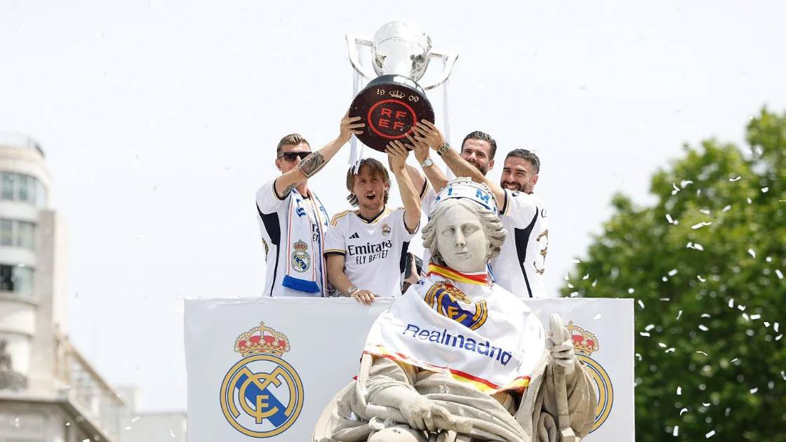 El momento culminante llegó cuando el capitán Nacho le puso una bufanda y una bandera del Real Madrid a la estatua de la diosa y ofreció el trofeo desde lo alto de Cibeles.