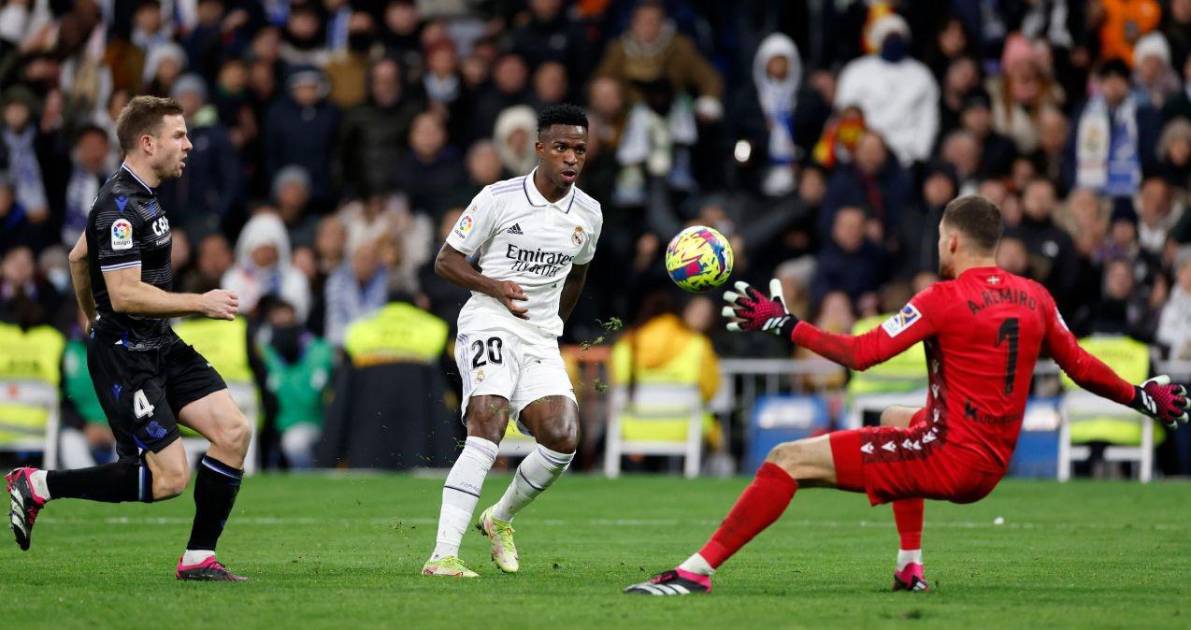 El portero volvió a salvar a su equipo tras el paso por los vestuarios. Espectacular combinación entre Benzema y Vini Jr., que terminó con una definición del brasileño con la zurda en el 49’ y un despeje con el pie del portero de la Real Sociedad.