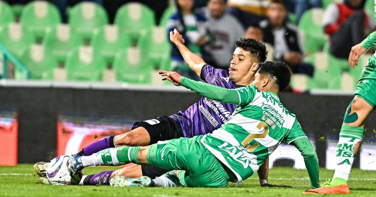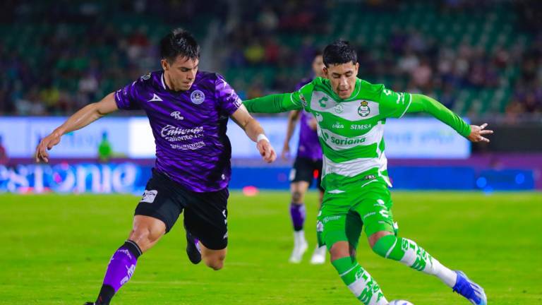 (I-D), Emerson Rodriguez de Santos y Sergio Flores de Mazatlan durante el partido Santos vs Mazatlan FC, correspondiente al Play In del Torneo Apertura 2023 de la Liga BBVA MX, en el Estadio TSM Corona, el 23 de noviembre de 2023. ( )