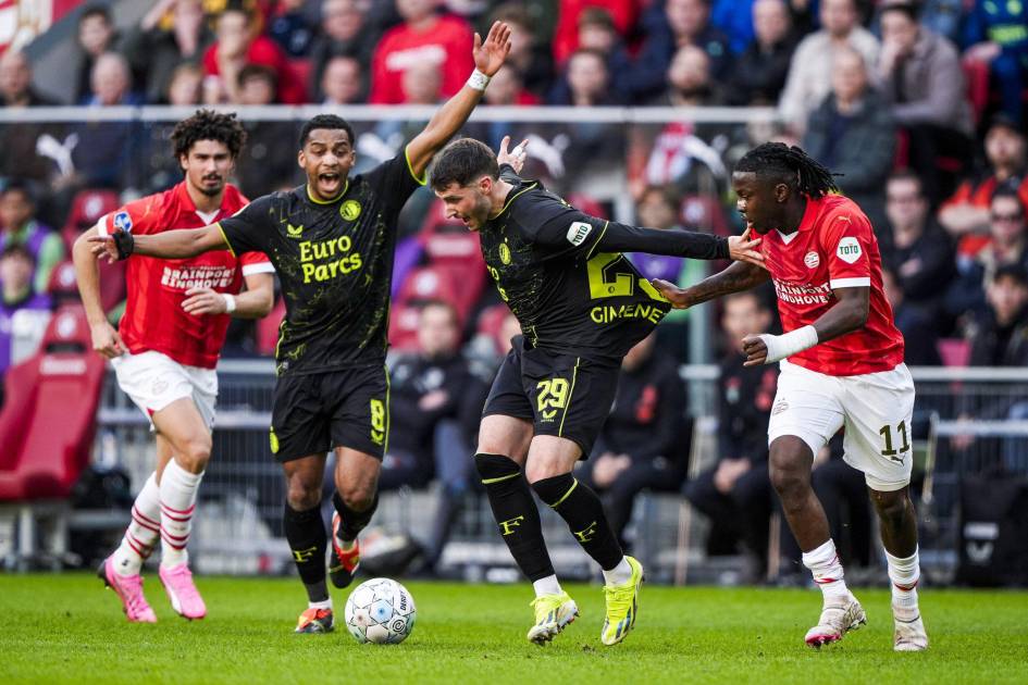 EINDHOVEN._ El delantero mexicano Santiago Giménez se reencontró con el gol y lo hizo en el empate de su equipo el Feyenoord 2-2 ante el líder PSV del también mexicano Hirving “Chucky” Lozano, por la fecha 24 de la Eredivisie.