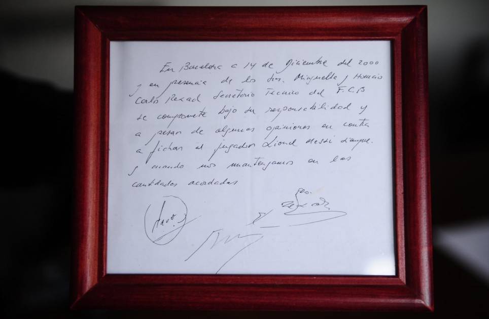 “En Barcelona, a 14 de diciembre del 2000 y en presencia de los Srs. Minguella y Horacio, Carles Rexach, secretario técnico del FC Barcelona, se compromete bajo su responsabilidad y a pesar de algunas opiniones en contra a fichar al jugador Lionel Messi siempre y cuando nos mantengamos en las cantidades acordadas”, dice la servilleta.