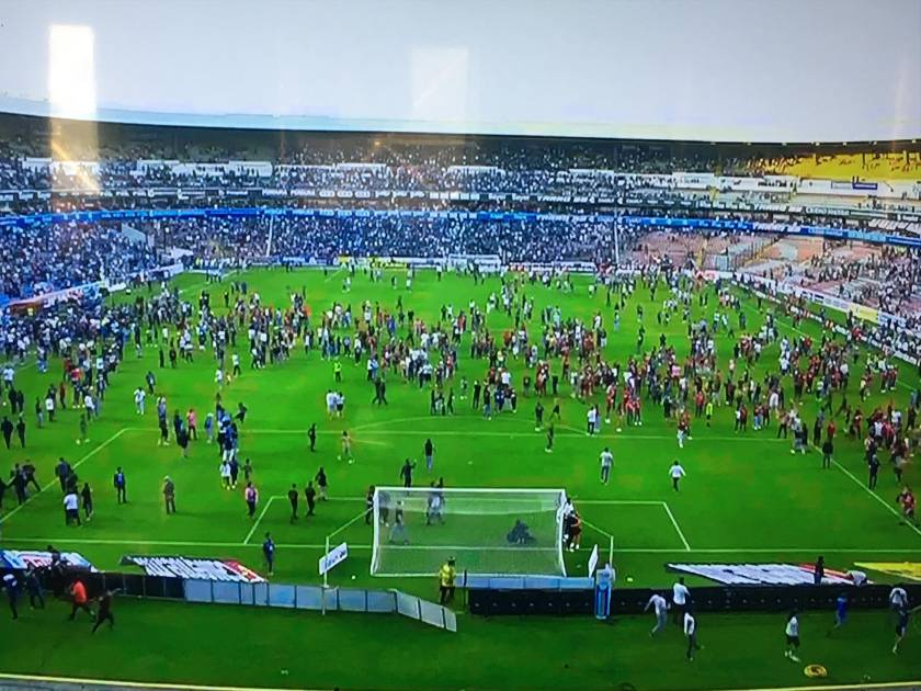 QUERÉTARO._ Debido a la violencia que se suscitó en las gradas del Estadio La Corregidora de Querétaro, los aficionados tuvieron que entrar al campo de juego y esto motivó que el partido entre Gallos y Atlas se suspendiera. Todo como parte de una imagen lamentable en el futbol mexicano.