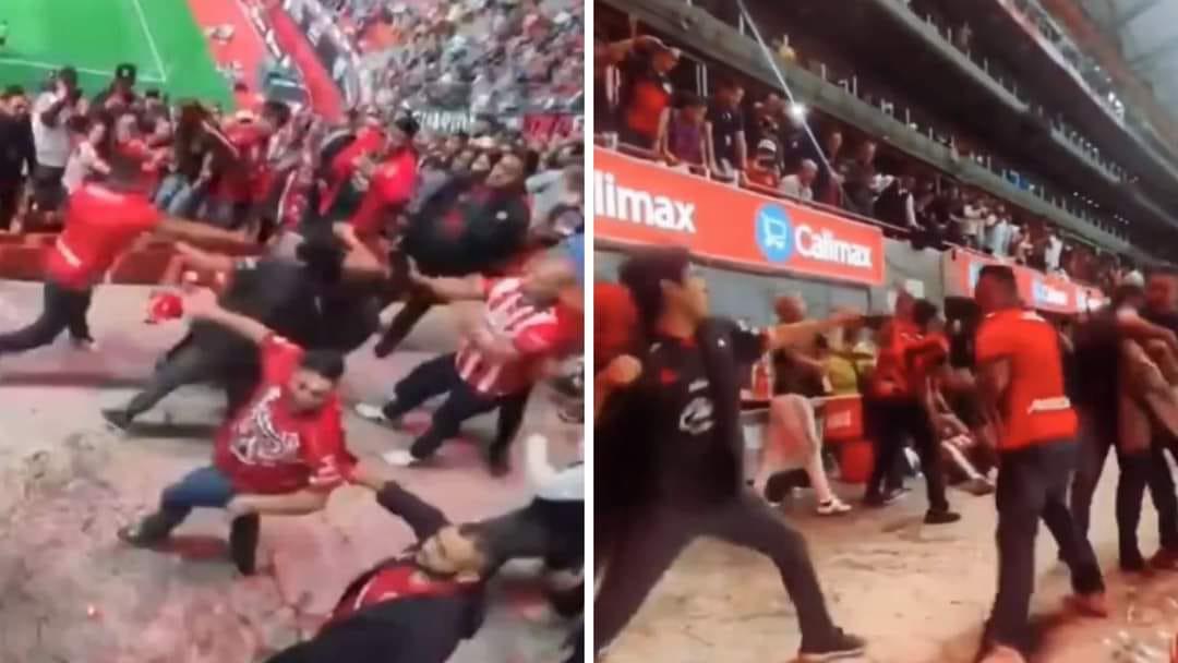 En imágenes que circulan en redes sociales se ve cómo seguidores de ambos equipos comienzan a pelearse dentro del estadio. Uno de ellos, con una camiseta negra de los Xolos, aparece después en otra imagen en el suelo y sangrando afuera del inmueble.