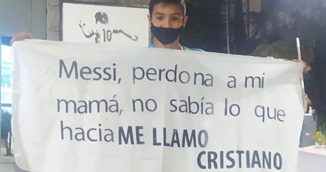 Una imagen tomada por el periodista argentino Gastón Edul, quien compartió la instantánea del joven sujetando un cartel en el que se lee: “Messi, perdona a mi mamá. No sabía lo que hacía, me llamo Cristiano”. Un mensaje en el que hace referencia a la eterna rivalidad entre el crack del París Saint-Germain y Cristiano Ronaldo.