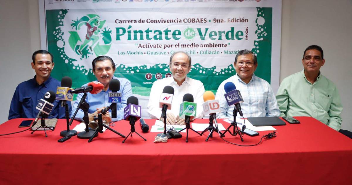 LOS MOCHIS._ Con el objetivo de fomentar la convivencia familiar mediante la práctica del deporte y la activación física como parte de la formación integral del ser humano en la sociedad sinaloense, autoridades educativas del Colegio de Bachilleres del Estado de Sinaloa (Cobaes), encabezadas por el director general de la institución, Santiago Inzunza Cázares, presentaron la 9ª edición de la Carrera Píntate de Verde 2024 “Actívate por el Medio Ambiente”, que espera reunir la participación de 21 mil asistentes entre estudiantes, padres y madres de familia, docentes, autoridades y familias en general, en todo el estado.