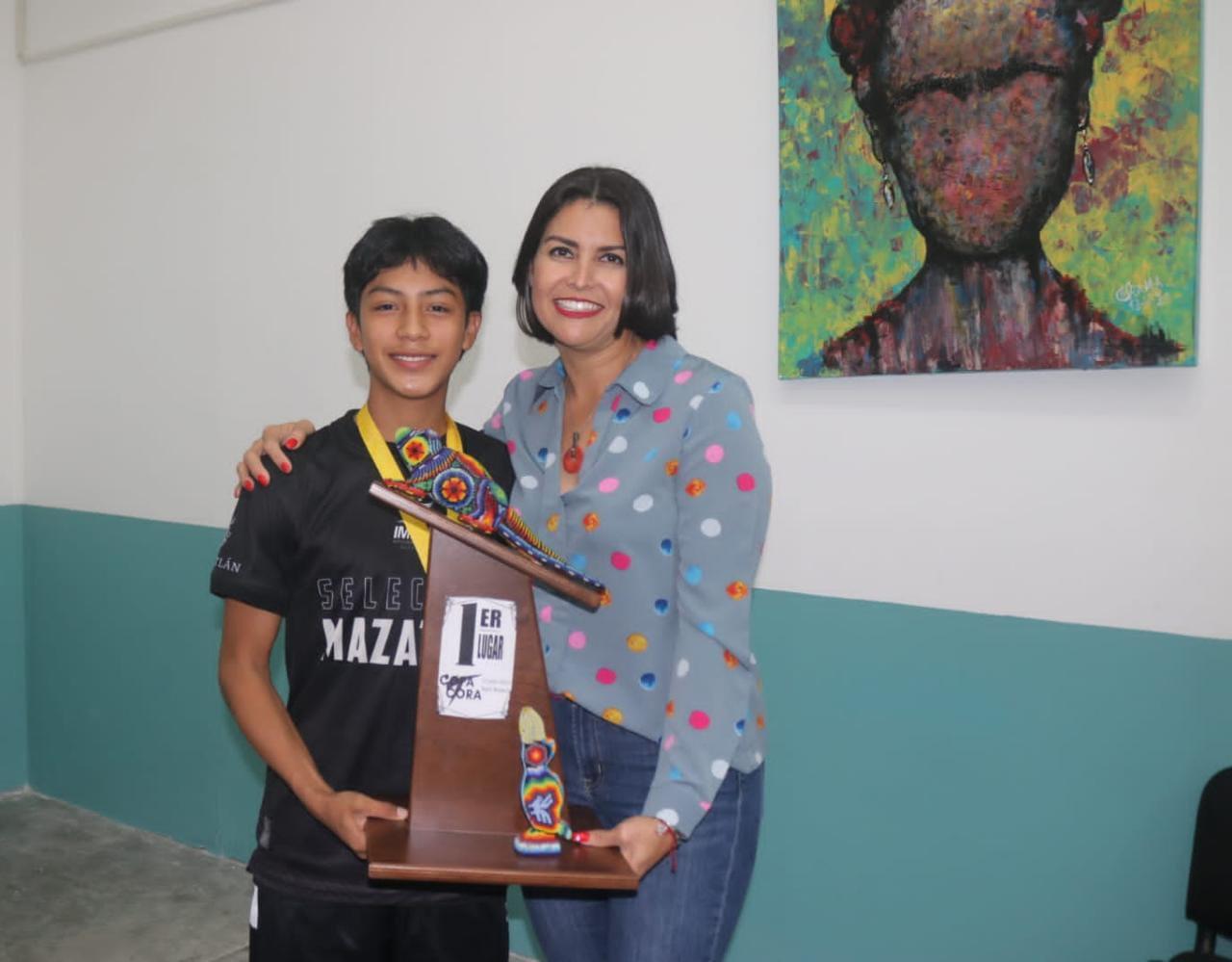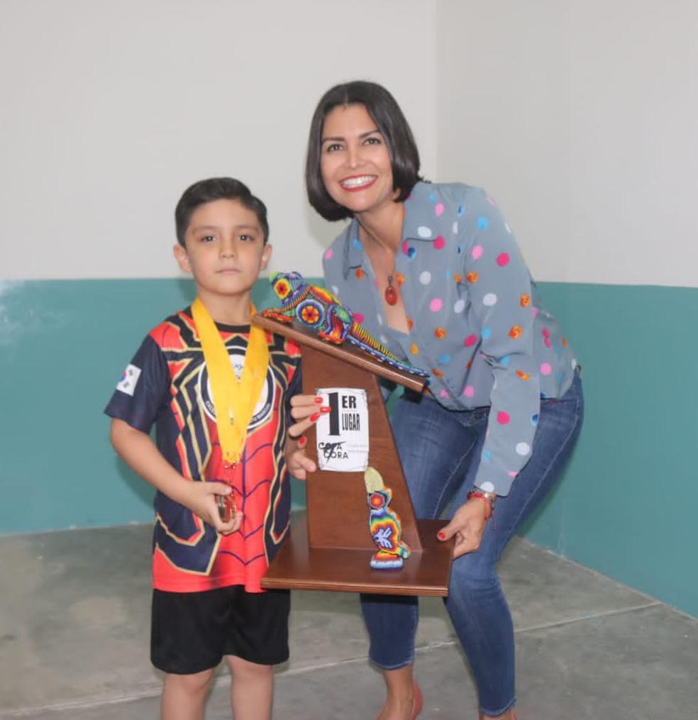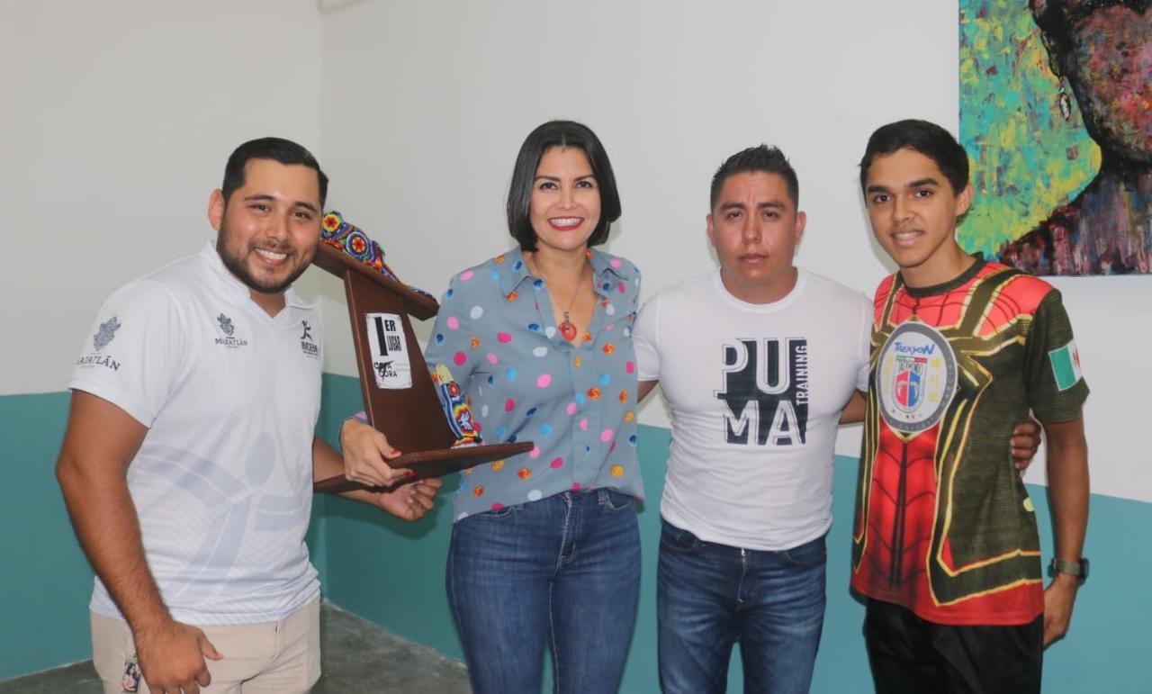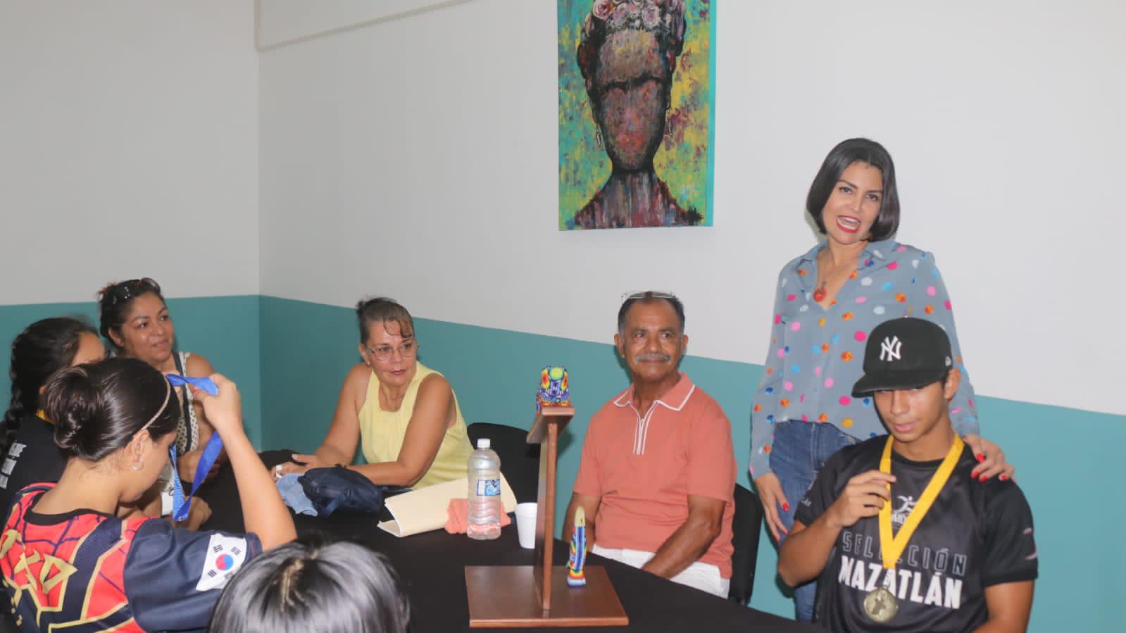 MAZATLÁN._ Tras cosechar 36 medallas en la Segunda Copa Cora de Taekwondo, la delegación mazatleca encabeza por el entrenador Juan Manuel Ortega Teutle se reunió con la directora del Instituto Municipal del Deporte, Fabiola Verde Rosas, para entregarle el trofeo de primer lugar, obtenido en tierra nayarita.