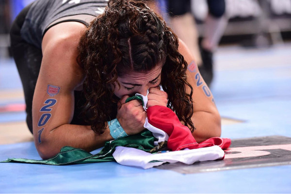 Ya sin fuerzas y en el suelo, la mexicana puede perder el evento, pero un tatuaje en sus brazos reza: “donde termina mi fuerza comienza la de Dios”, así que se levanta y gana.