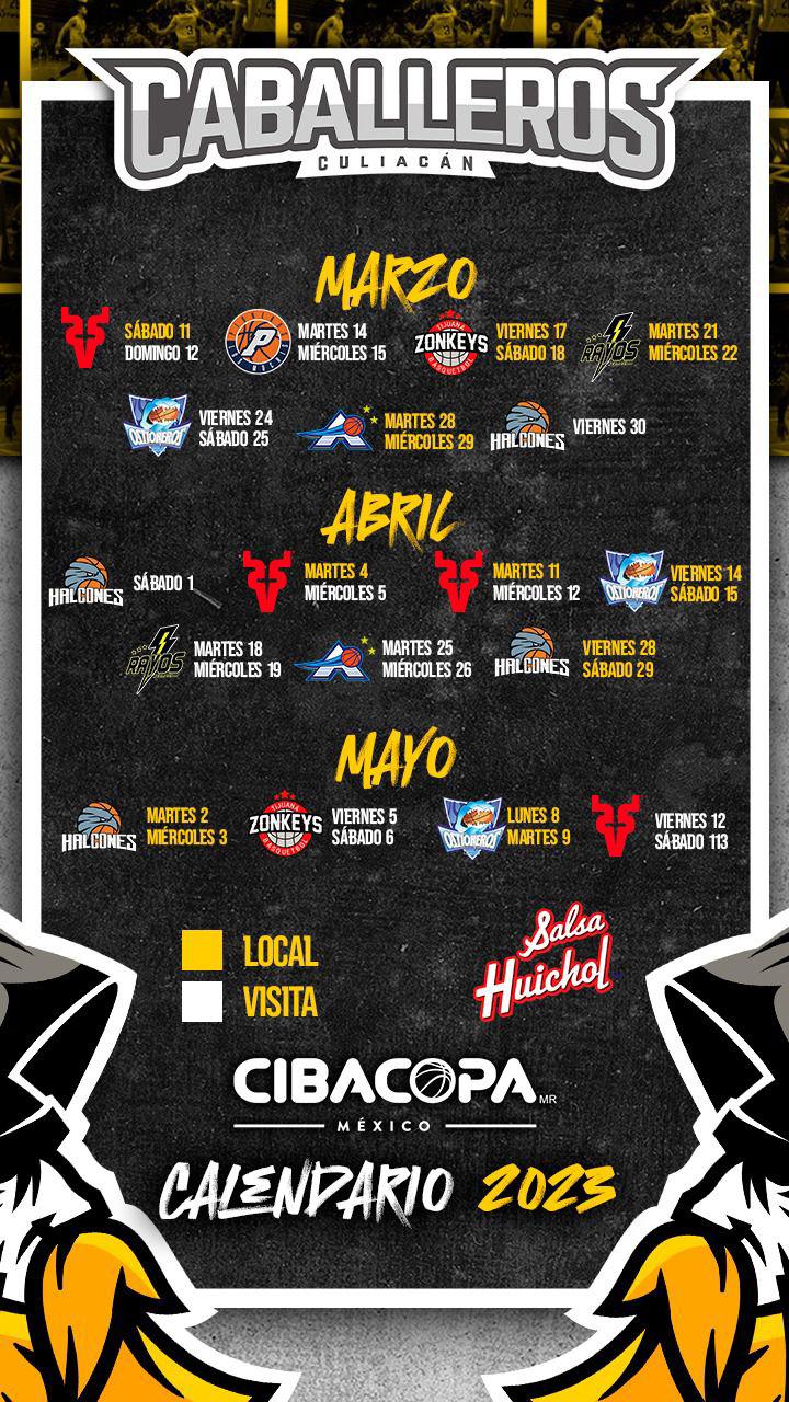 Para lo que será su primera serie formal de la temporada, Caballeros visitará a Pioneros de Los Mochis los días 14 y 15 de marzo, para posteriormente, tener doble serie en casa, siendo sus adversarios Zonkeys de Tijuana (17 y 18 de marzo) y Rayos de Hermosillo (21 y 22 de marzo).