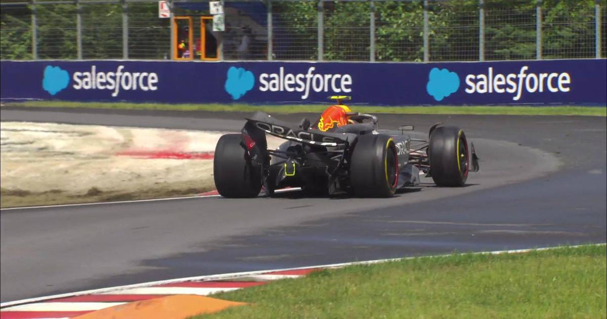 Ya con slicks en el auto, Checo tocó una parte del pavimento húmedo antes de entrar a una de las curva y eso lo hizo perder el control del monoplaza por completo, llevándolo a estrellarse contra el muro, rompiendo el alerón trasero y con lo cual tuvo que abandonar la competencia en Canadá.