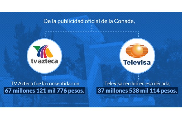 Pero por lo menos de la publicidad oficial de la Conade, TV Azteca fue la consentida. Televisa, su competidora histórica, recibió en esa década, 37 millones 538 mil 114 pesos; es decir, 29 millones 583 mil 662 menos. Y otros medios, con programas especializados en Deportes, como Telefórmula y ESPN, apenas tuvieron entre las dos, 12 millones 12 mil 666 pesos. La primera emisora obtuvo nueve millones 842 mil 750 y la segunda, dos millones 169 mil 916 pesos.