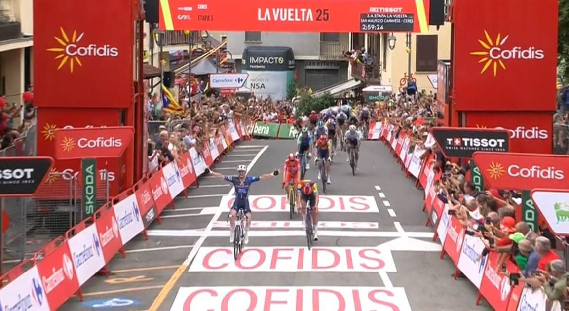 CERES, Italia._ Por sorpresa y con un golpe de astucia en los últimos metros, el francés David Gaudu (Groupama FDJ) rompió el pronóstico para adjudicarse la tercera etapa de la Vuelta a España, disputada entre San Maurizio Canavese y Ceres, de 134,6 km, en la que mantuvo el liderato el danés Jonas Vingegaard.