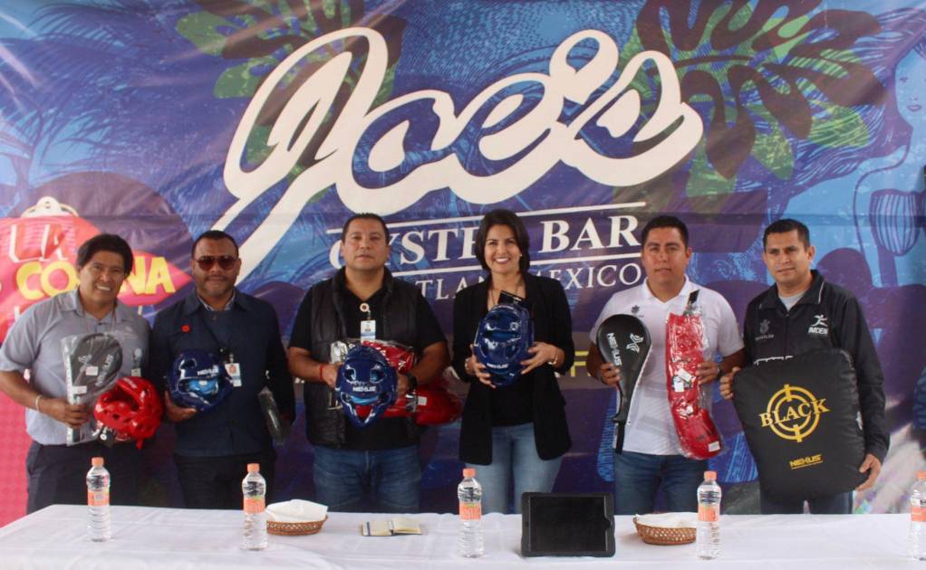 Este miércoles, con la presencia de la directora del Instituto Municipal del Deporte, Fabiola Judith Verde Rosas, Christian Mondragón, gerente de Oyster Bar, hizo la entrega formal del material deportivo que tiene un valor cercano a los 90 mil pesos, con lo que se beneficiará a más 60 artemarcialistas.