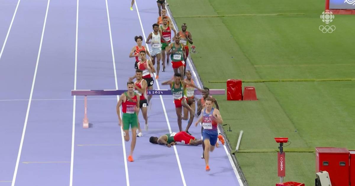 El Bakkali superó a Rooks en la última curva antes de que el estadounidense lograra su mejor marca personal y se adjudicara la medalla plateada. Tras la caída en la penúltima barrera, a doscientos metros de la meta, Girma fue evacuado del lugar en camilla y las imágenes generaron inquietud. Luego se supo que recuperó el conocimiento antes de ser trasladado al hospital Pitié Salpetrière, en el distrito 13 de París, para ser sometido a exámenes.