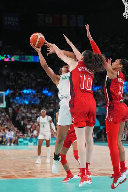 Al enfrentarse a la escuadra peor clasificada de la fase eliminatoria, los Estados Unidos aprovecharon por 40 minutos dicha ventaja. Su operación la realizaron al pie de la letra en la primera mitad contra Nigeria y pudieron relajarse en un momento al punto de tener una diferencia de 30 unidades -cerca de lo cometido un día antes por sus compañeros en el masculino contra Brasil-. Todo ello de nuevo propiciado por el tándem Wilson-Stewart que se combinó para 33 unidades, en compañía de 15 más por parte de Jackie Young.