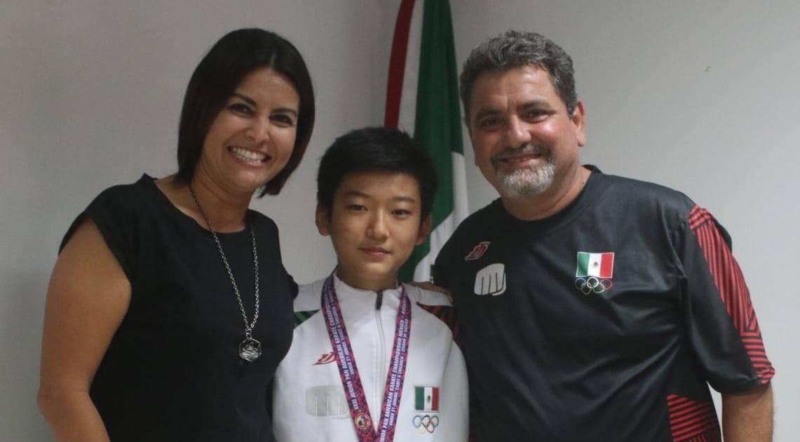 Kaito Daniel Yoshii Mizukami y su entrenador Jesús Moreno Salas hicieron una visita de cortesía a la directora de Instituto Municipal del Deporte, Fabiola Verde Rosas, para platicar sobre la experiencia vivida en el Campeonato Panamericano de Karate Juvenil y agradecer el apoyo brindado.