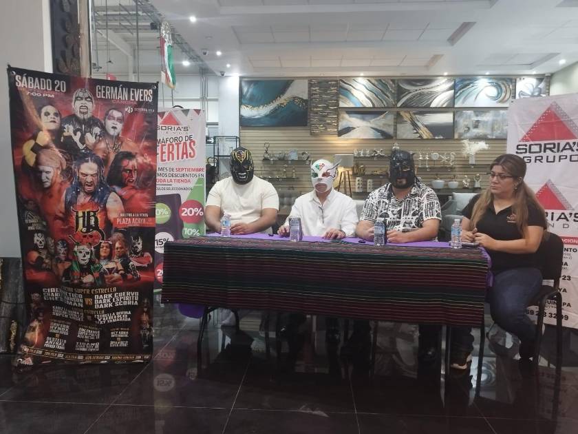 Anunciaron el cartel los luchadores Súper Ángel, Antrax y Rynox, junto con Maggy Piña, jefe comercial de Tiendas Soria’s.