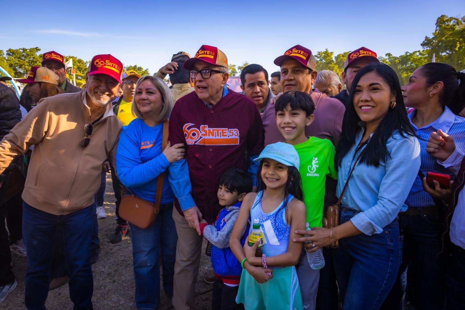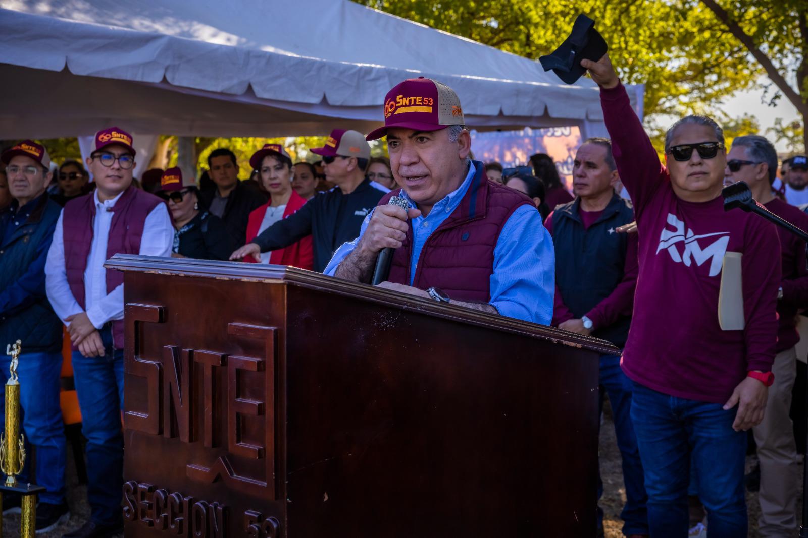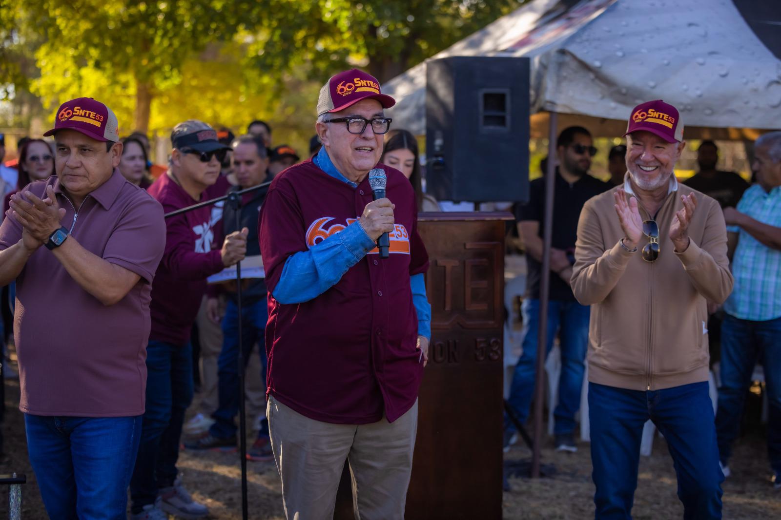 Durante el evento, el líder sindical Ricardo Madrid entregó un reconocimiento al gobernador en nombre del SNTE Sección 53, agradeciendo su apoyo al magisterio.