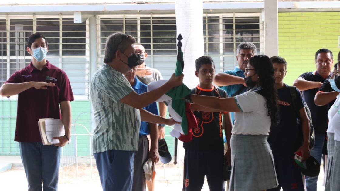 Los mejores atletas de las disciplinas de voleibol de sala, voleibol de playa y atletismo, se reunieron en la explanada del plantel 38 Mazatlán Bonfil, para llevar a cabo los honores a la bandera y entonar el himno nacional.