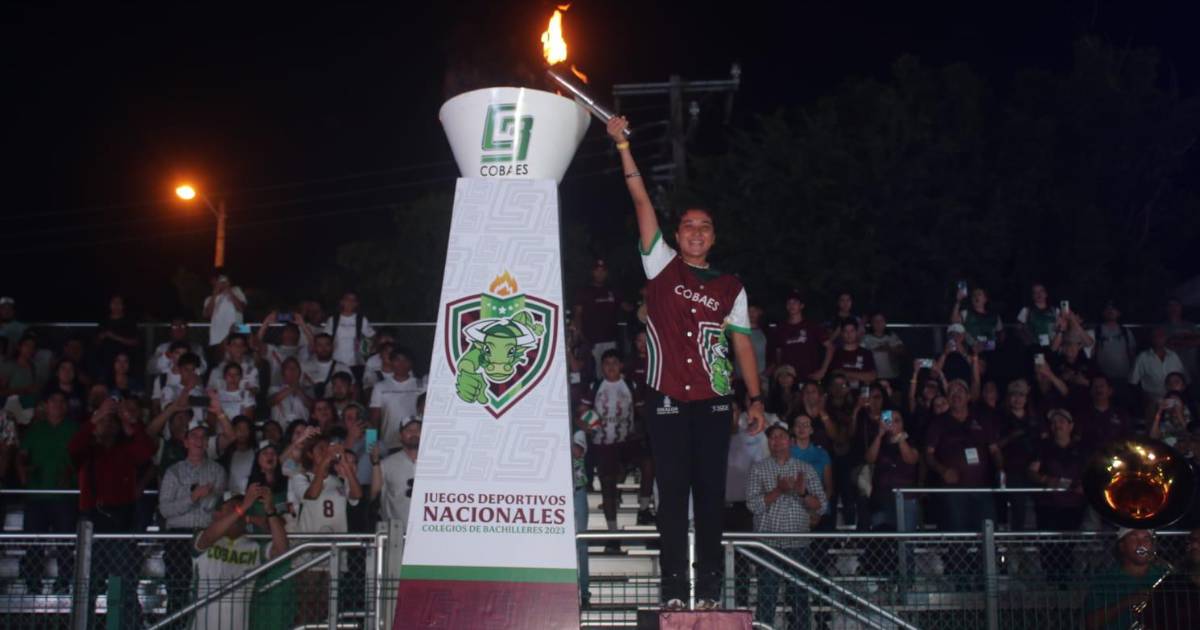 La llama del pebetero fue encendida por Ashley María Armenta Ruiz, quien es alumna del Plantel 03 de Sinaloa y ostenta una medalla de oro en beisbol 5 en Juegos Nacionales Conade 2023 así como participación con el equipo nacional Sub 18 en Ankara, Turquía.