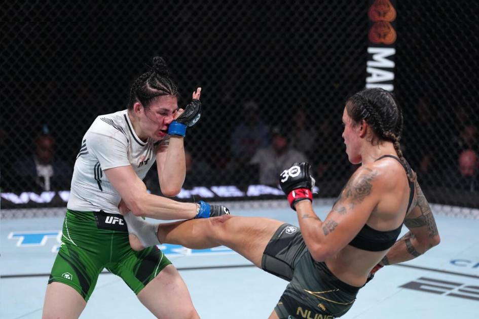 Nunes conectó volumen de patadas a las piernas y combinaciones de puños sobre la sinaloense, quien respondió a algunos ataques, pero no soltó las manos. La brasileña se anotó un derribe del que se levantó rápidamente Aldana.