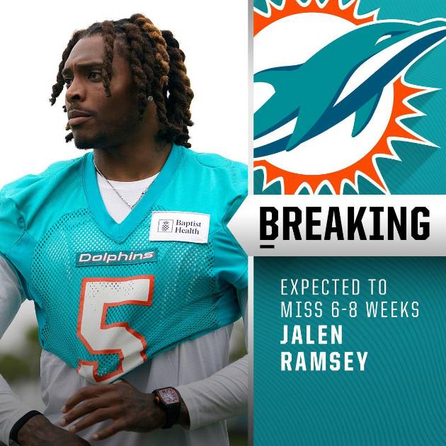 Se espera que el esquinero de los Miami Dolphins, Jalen Ramsey, se pierda al menos de seis a ocho semanas debido a una lesión en el menisco que requerirá cirugía en la rodilla izquierda, informaron el jueves, Tom Pelissero y Mike Garafolo, de NFL Network. Ramsey se lesionó en la práctica de Miami más temprano ese día.