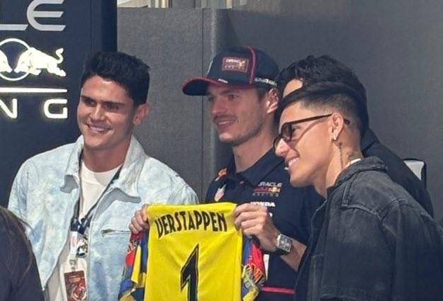 Los futbolistas sorprendieron al neerlandés con una playera azulcrema personalizada con el número 1, gesto que desató sonrisas y rápidamente se volvió viral en redes sociales. Las imágenes mostraron a un Verstappen relajado y sonriente, en la antesala de un fin de semana clave para sus aspiraciones en el campeonato.