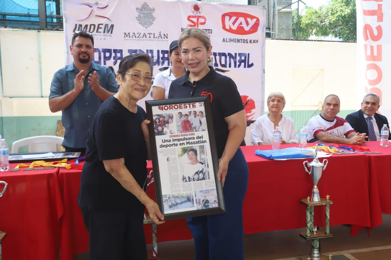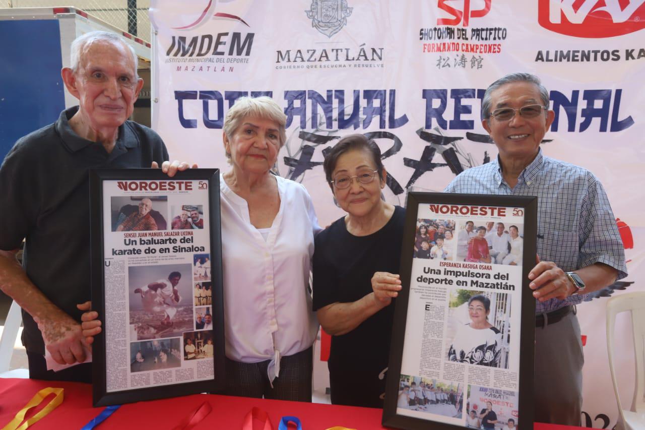 Acudieron a la mesa de honor Esperanza Kasuga, directora general de Alimentos Kay y patrocinadora del evento; Elizabeth Peraza Mendoza, directora ejecutiva de Editorial Noroeste; Fabiola Verde Rosas, directora del Instituto Municipal del Deporte de Mazatlán; Juan Manuel Salazar Licona, sensei local y denominado el padre de este deporte en Sinaloa, acompañado de su esposa, la también sensei Eliza Gómez.