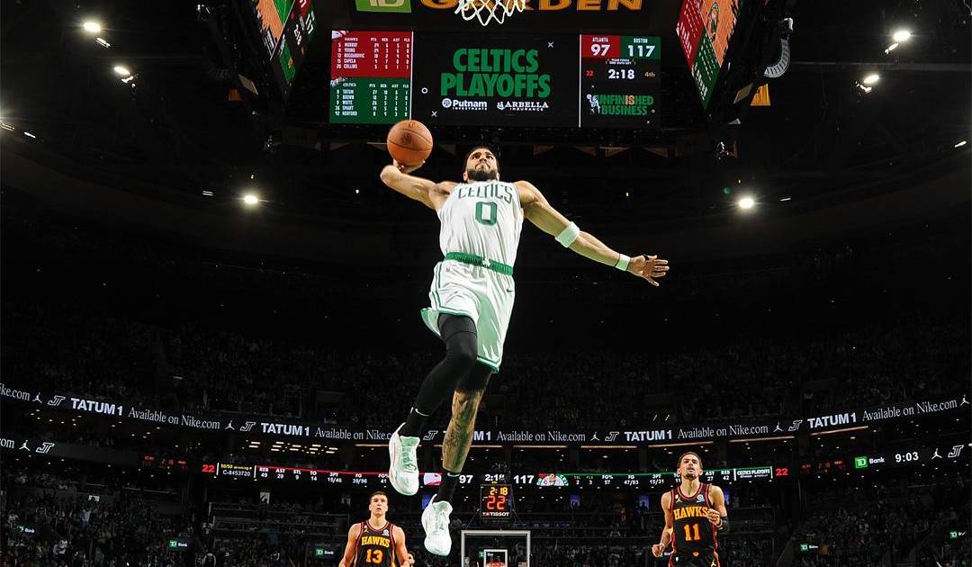 BOSTON._ Jayson Tatum anotó 29 puntos y logró una volcada enfática para coronar una buena racha en el ocaso del encuentro que los Boston Celtics ganaron el martes 119-106 a los Atlanta Hawks.
