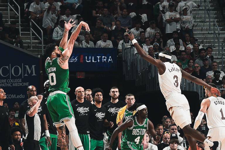CLEVELAND._ Jayson Tatum anotó 33 puntos con LeBron James observando desde un asiento a nivel de cancha, y los Celtics de Boston vencieron en el Juego 4 a unos severamente mermados Cavaliers de Cleveland, 109-102 el lunes por la noche para comandar la serie 3-1 en las semifinales de la Conferencia Este.