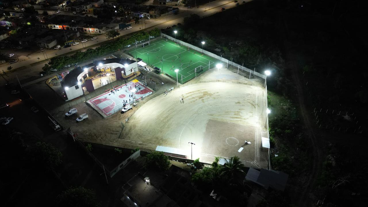 La recuperación del espacio incluyó el mantenimiento del pasto sintético de la cancha de futbol, la construcción de bancas para las tres canchas, el enrejado perimetral, instalación de contenciones, pintura general y la instalación de la iluminación LED para todo el complejo deportivo, además de la instalación de una jaula de bateo y gradas para el público.