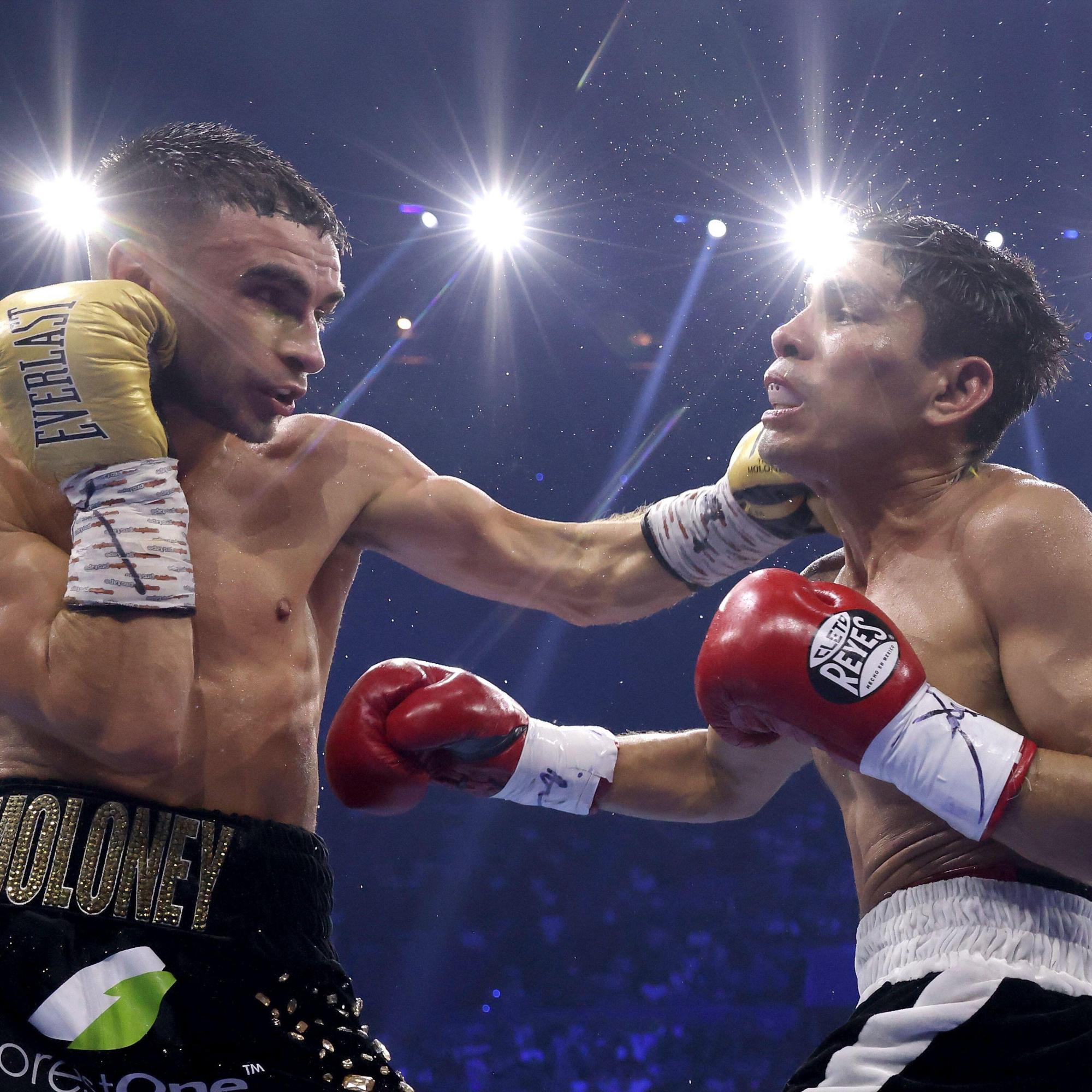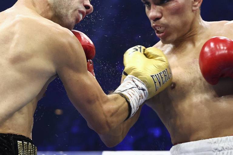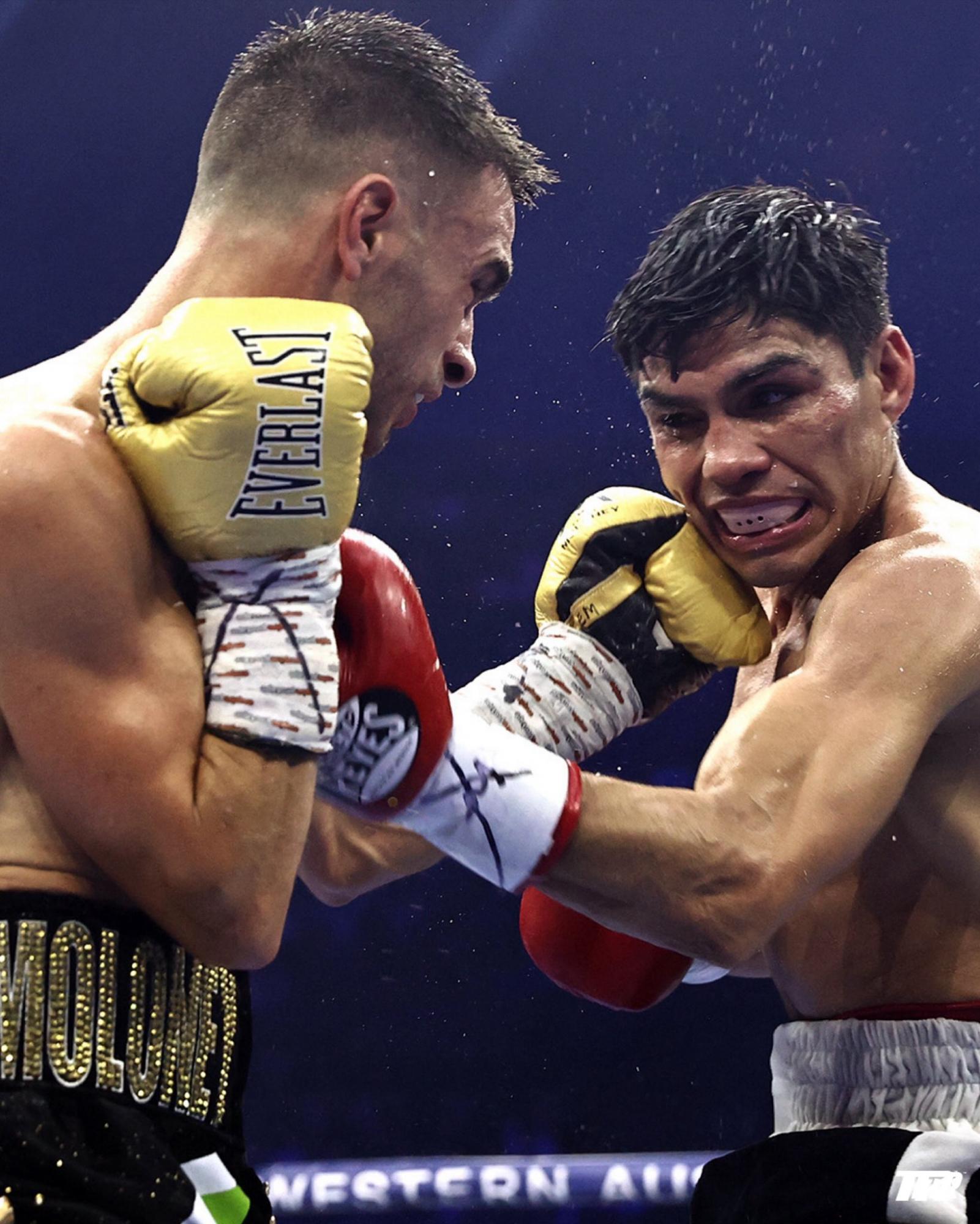 Pero el mexicano hizo ajustes en la marcha, esquivó el fuerte jab de Moloney, lo contragolpeó a los bajos, y la pelea se volvió intensa.